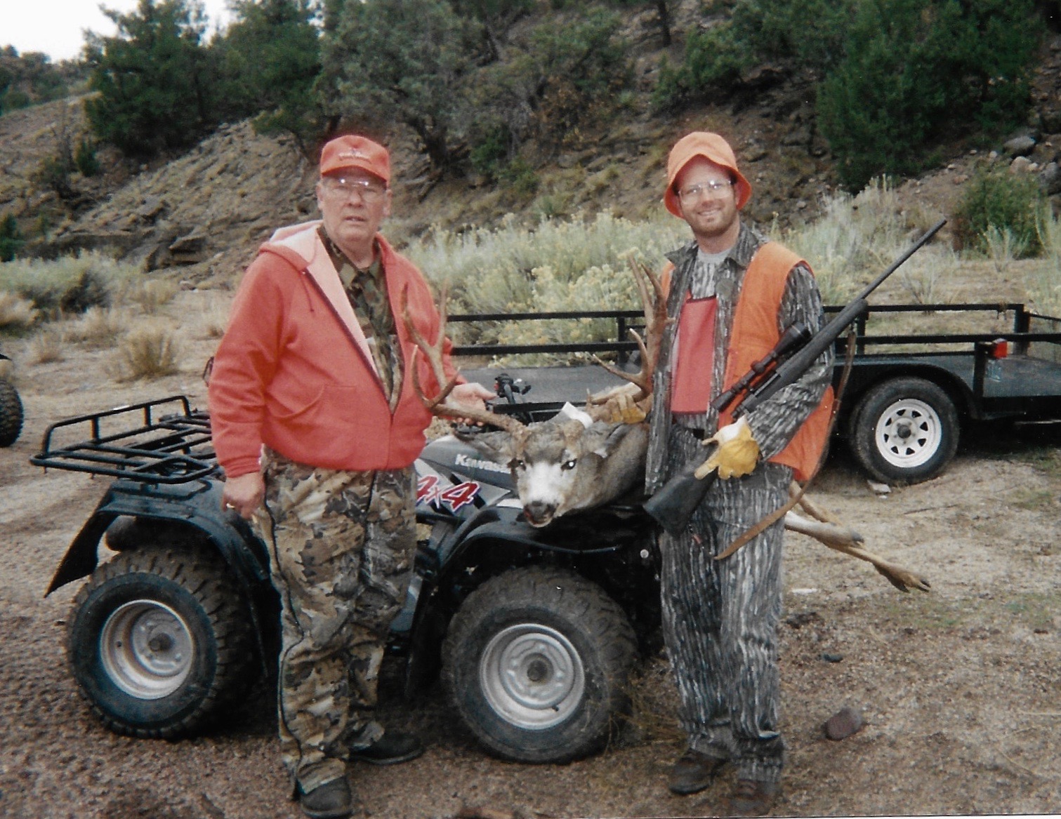 I asked David if we could drag the deer down the ravine to the camp.We scouted the area below and found that the ravine plunged over ledge rock that would be impossible to navigate by ourselves, much less with a deer carcass.Our only way out was the way we had come in.We attached a rope to the deer’s antlers, David climbed to the closest piñon tree and snubbed the rope.I would lift the deer up the slope and David would take up the slack.For the next 100 yards, I would lift the deer while David pulled hard on the rope, then would snub it on a piñon tree while I climbed another step up the hill.Eventually, we reached the top of the ravine and dragged the beast another 900 yards along the side of the ridge to the four-wheeler.